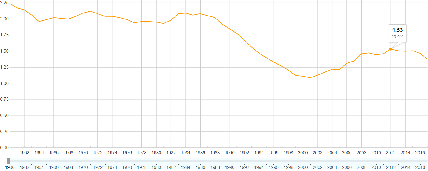 Рождаемость держалась на уровне выше 1,5 до 2015 года, после чего начала резко падать. В 2016 году до 1,47, а на следующий год - до 1,37. То есть до уровня 2008 и 2007 годов.