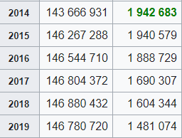 В соседней России тенденция та же, что и в Украине - рождаемость начала снижаться после 2015 года. При том что количество населения росло - видимо, за счет мигрантов (в том числе из Донбасса).