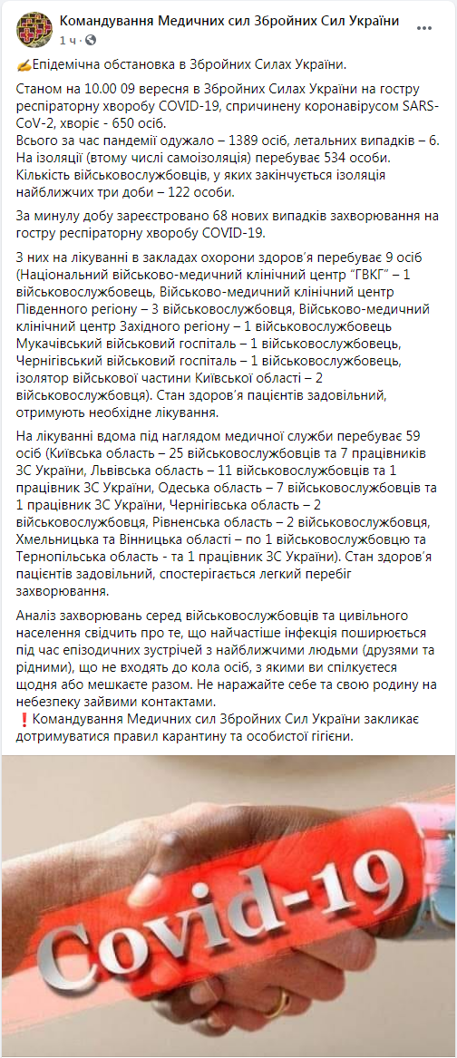 Всего по состоянию на 10:00 9 сентября в ВСУ Covid-19 болеет 650 человек. Всего за время пандемии выздоровели 1389 человек, летальных исходов - 6.