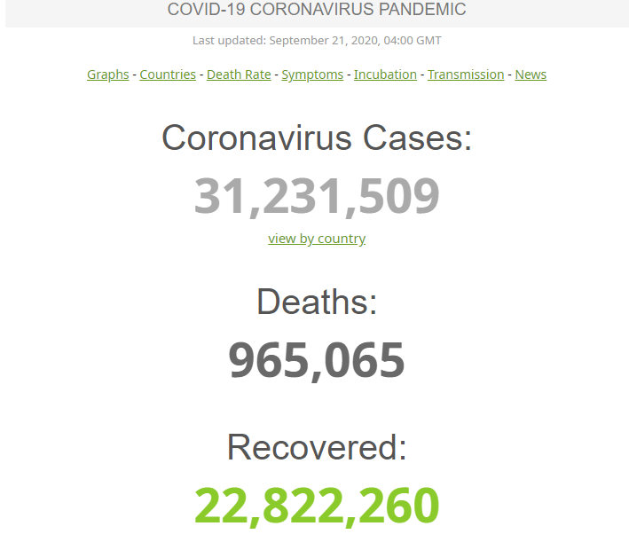 Так, по данным на утро, 21 сентября, в мире уже насчитывается 31 231 509 зараженных. Коронавирус стал причиной смерти для 965 065 человек. Выздоровело с начала пандемии 22 822 260 пациентов.