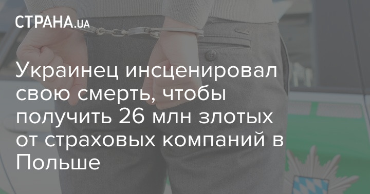 Полиция Польши задержала 38-летнего украинца, которые пытался требовать 26 млн злотых в нескольких страховых полисах, инсценировав свою смерть с помощью украинских спецслужб. Теперь ему грозит 10 лет лишения свободы.