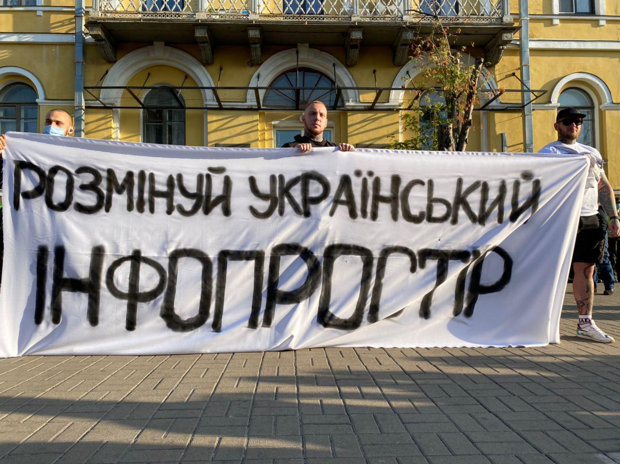 Также они держат в руках баннер на котором написано "разминируй украинское информпространство".