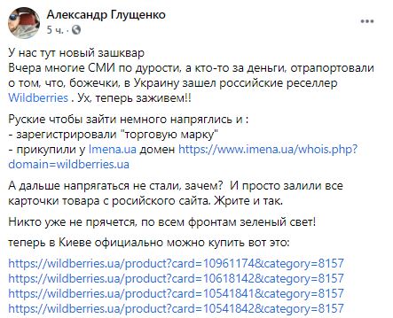 Медиаэксперт Александр Глущенко объяснил, как это произошло. По его версии, россияне зарегистрировали торговую марку и купили у Imena.ua домен wildberries.ua. А дальше просто залили все карточки товара с российского сайта.