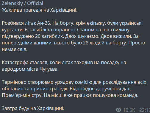 Разбился самолет Ан-26. На борту, кроме экипажа, были украинские курсанты. Есть погибшие и раненые... Просто нет слов.