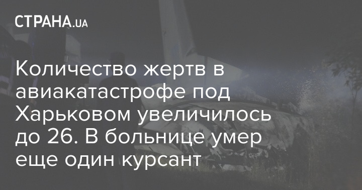 "Число погибших в авиакатастрофе в харьковской области увеличилось до 26 человек: один пострадавший умер в больнице", - говорится в сообщении.