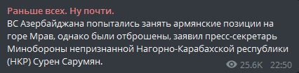 Напомним, ранее Азербайджанская сторона поспешила заявить, что взяла стратегическую высоту в Карабахе. "В результате военной операции, проведенной нашими войсками в направлении Геранбоя, была освобождена высота Муров на хребте Муров", - сообщили в минобороны страны.