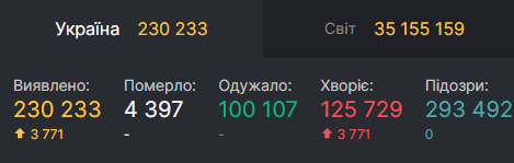 С начала эпидемии Covid-19 в Украине скончался 4 397 пациент с этим диагнозом. Выздоровели уже 100 107 пациентов. Число активных случаев коронавирусной болезни в Украине, по последним данным, составляет 125 729 человек (+ 3 771 за сутки).