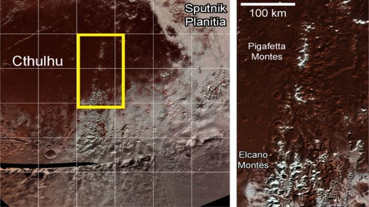 Так, в 2015 году космический аппарат New Horizons обнаружил на Плутоне, неподалеку от равнины Спутника, горы, расположенные на высоте 2,5-3,5 километра над подножием или на высоте четыре километра по сравнению со средней высотой равнин Плутона.