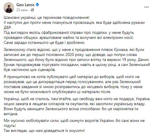 "Под видом какой-то сфабрикованного дела о налогах, у меня будут проведены обыски, арестованное имущество и изъяты все электронные носители" - сообщил Лерос.
