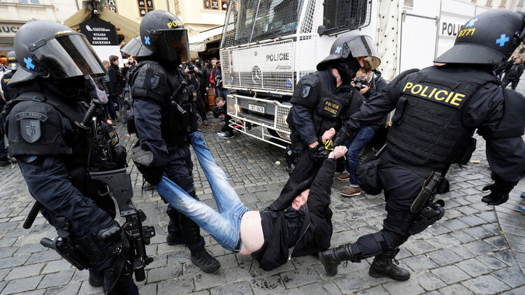 В Праге митинг футбольных и хоккейных фанатов без масок перерос в столкновения с полицией. Видео