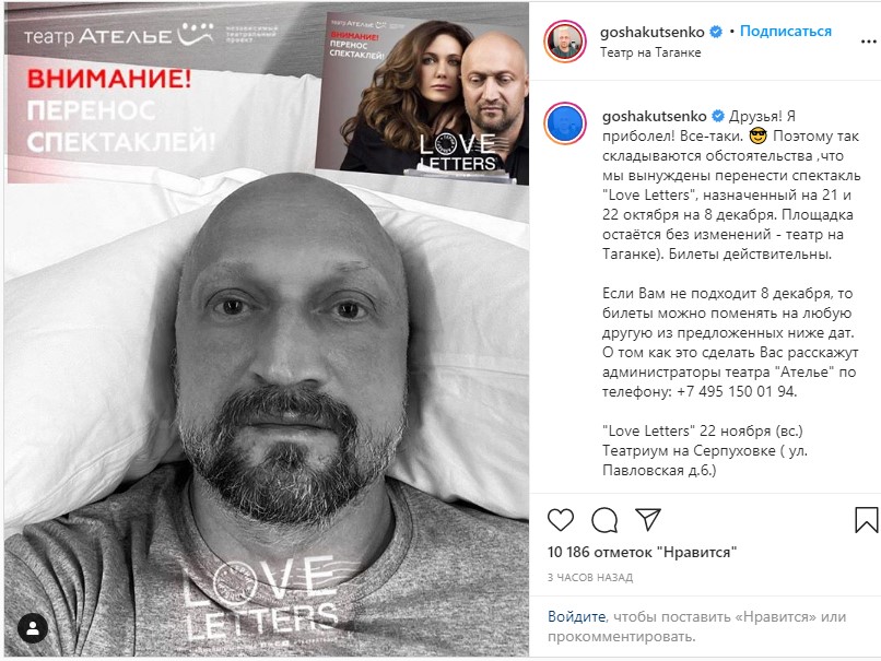 Сам же артист написал в своем Instagram-аккаунте о вынужденном переносе спектакля Love Letters, назначенного на 21 и 22 октября: "Ковид - коварнейший персонаж! Вот и мне пришлось его исполнить! Носите маски! Держите дистанцию. Не будьте безрассудны. Помогите Себе и Врачам", - написал Куценко.