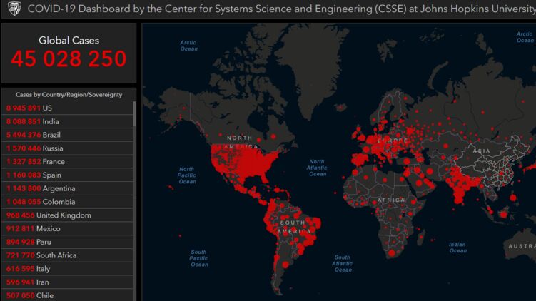 По данным на 30 октября, число зараженных в мире превысило 45 миллионов человек, фото: arcgis.com