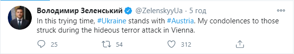 "В настоящее время испытаний Украина остается вместе с Австрией. Я выражаю соболезнования всем пострадавшим во время чудовищного теракта в Вене", - написал глава государства в своем официальном Twitter.