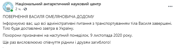 "Информируем вас, что все административные вопросы с транспортировкой тела Василия завершены. Тело будет доставлено завтра в Украину. Похороны назначены на следующий понедельник, 9 ноября 2020г. Еще раз выражаем соболезнования родным и друзьям погибшего!", - написали на официальной страничке в соцсети научного центра.