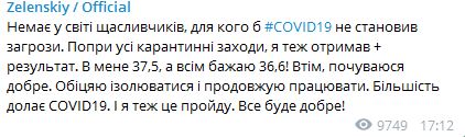 "Нет в мире счастливчиков, для кого бы COVID19 не представлял угрозы. Несмотря на все карантинные мероприятия, я тоже получил + результат. У меня 37,5, а всем желаю 36,6! Впрочем, чувствую себя хорошо. Обещаю изолироваться и продолжаю работать. Большинство преодолевает COVID19. И я тоже это пройду. Все будет хорошо!" - говорится в сообщении.
