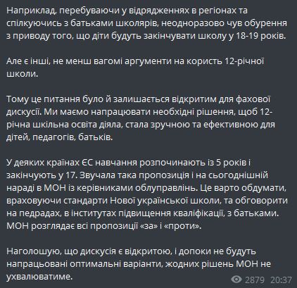 "Этот вопрос был и остается открытым для профессиональной дискуссии. Мы должны наработать необходимые решения, чтобы 12-летнее школьное образование действовало, стало удобным и эффективным для детей, педагогов, родителей", - написал Сергей Шкарлет.
