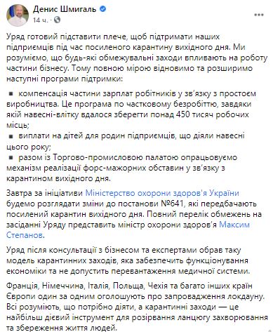 "Компенсация части зарплат работников в связи с простоем производства. Это программа по частичной безработице, благодаря которой весной-летом удалось сохранить более 450 000 рабочих мест. Выплаты на детей для семей предпринимателей, которые действовали весной этого года. Вместе с Торгово-промышленной палатой прорабатываем механизм реализации форс-мажорных обстоятельств в связи с карантином выходного дня", – написал Шмыгаль.
