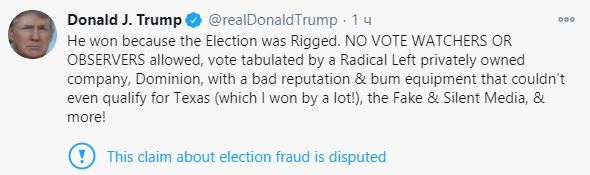 По его словам, победу Байдену обеспечила компания Dominion (производителе ПО для голосования Dominion Voting Systems), у которой было неисправное оборудование, а также СМИ, которые замалчивали нарушения.