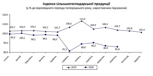 В Украине с января по октябрь 2020 года производство сельхозпродукции упало на 14,2% по сравнению с аналогичным периодом 2019 года, при этом за последний месяц спад еще сильнее ускорился.