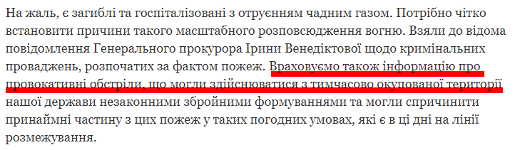 "Учитываем информацию о провокационных обстрелах, которые могли осуществляться с временно оккупированной территории нашего государства незаконными вооруженными формированиями и могли стать причиной по крайней мере части этих пожаров в погодных условиях, установившихся в эти дни на линии разграничения", - сообщалось на сайте Офиса президента Украины.
