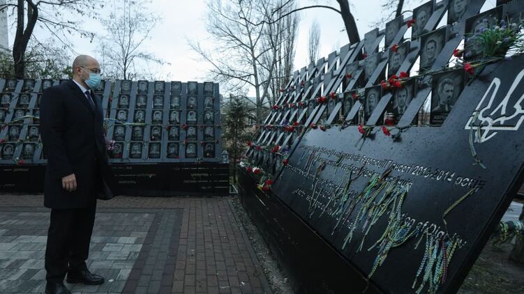 Премьер-министр Украины Денис Шмыгаль в субботу, 21 ноября, почтил память погибших героев Евромайдана, возложив цветы на аллее памяти Небесной сотни.