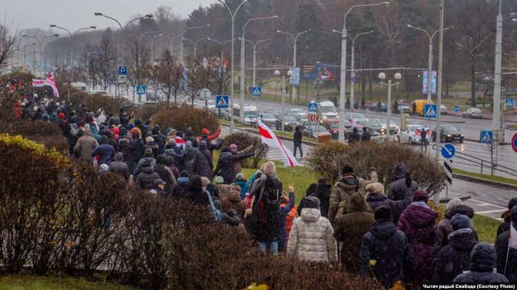 "В некоторых местах собравшиеся люди выходили на проезжую часть (ул. Руссиянова, ул. Матусевича и другие места), блокируя при этом движение участников дорожного движения и общественного транспорта. В целях безопасности граждан и участников дорожного движения сотрудники милиции вытеснили собравшихся граждан с проезжей части", - рассказали в главке.