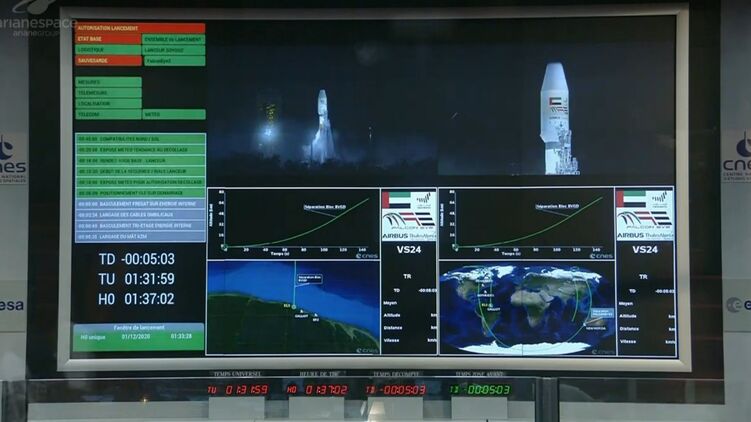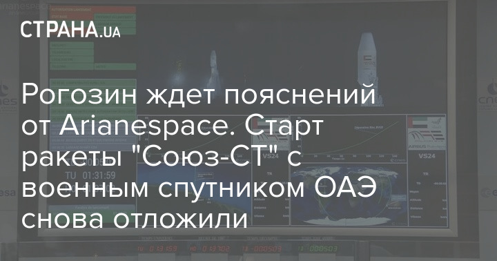Старт российской ракеты "Союз-СТ" с космодрома Куру во Французской Гвиане с военным спутником Объединенных Арабских Эмиратов (ОАЭ) Falcon Eye 2 на борту снова отложен.