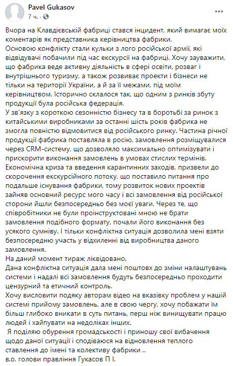 На обвинения отреагировал учредитель Клавдиевской фабрики Павел Гукасов. Он опубликовал длинный пост, в котором признал, что его предприятие ведет поставки в Россию. Правда, название этой страны Гукасов почему-то пишет с маленькой буквы (видимо, чтоб показать "патриотам", что он тоже не любит Россию).