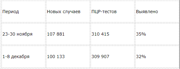 Сравним последние пять дней (среднее время для получения ПЦР-теста) и предыдущую пятидневку. С 4 по 8 декабря сделали 184 473 теста. А накануне - 190 957. То есть тестов было больше, а заболевших стало меньше.