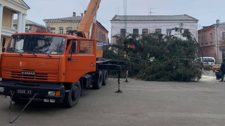 В Ровенской области, где водители не пропускали скорую помощь, в городе Дубно, на площади Независимости установили новогоднюю елку, которую срубили на кладбище.
