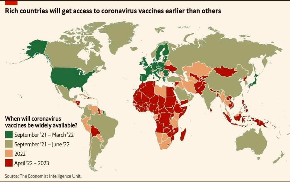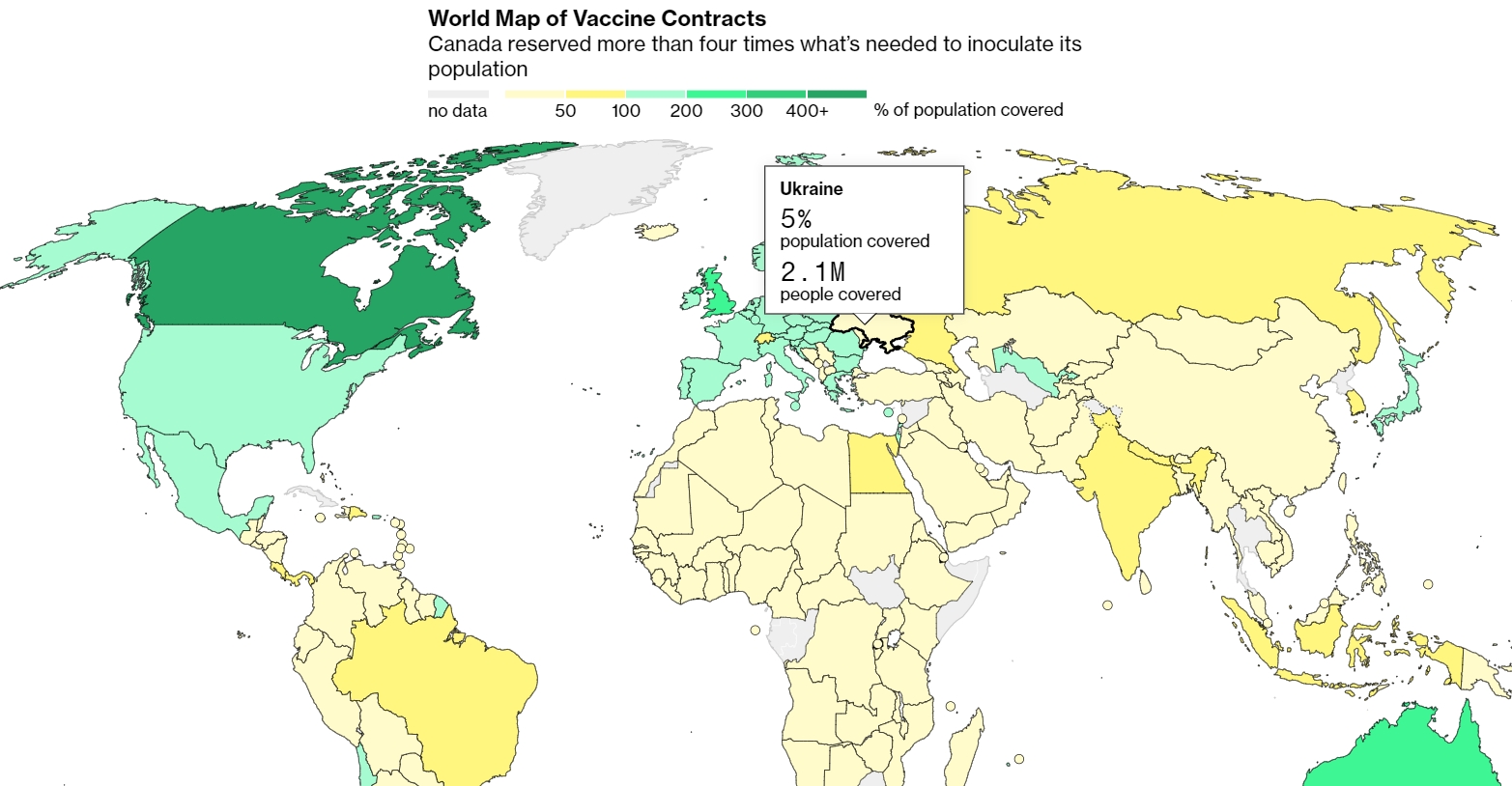 Для сравнения - Россия уже застолбила вакцину для 50% населения, Турция - для 30%. А богатые страны Запада и Евросоюз (зеленые зоны на карте) уже контрактуют количество доз, превышающих население - с прицелом на ревакцинацию, которую придется, судя по всему, проводить достаточно часто.