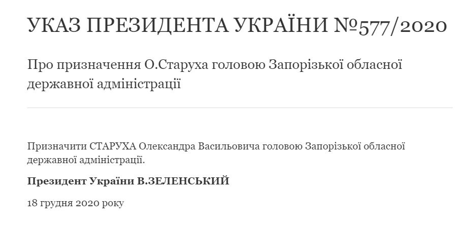 Президент Владимир Зеленский назначил Александра Старуха главой Запорожской областной государственной администрации (ОГА).
