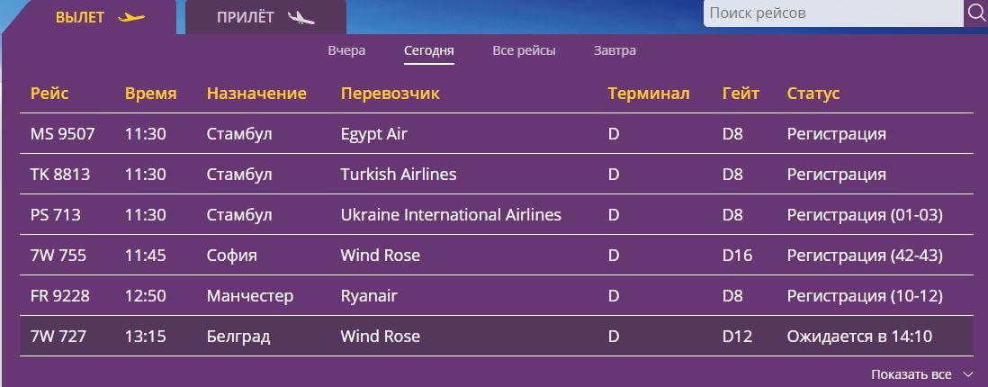 Скриншот вылетов онлайн-табло аэропорта "Борисполь" 21 декабря 2020 года