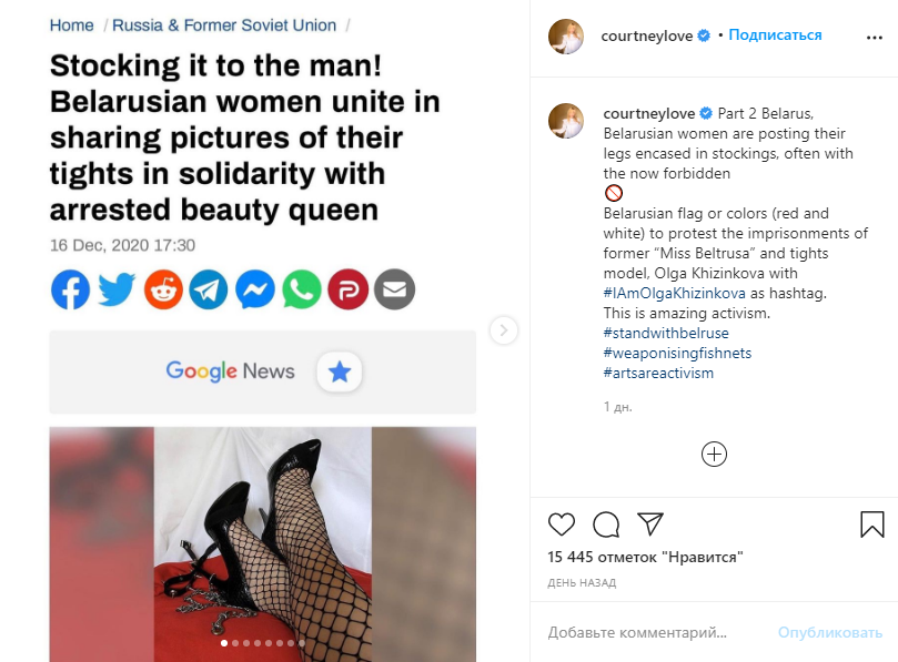В свою очередь, американская певица Кортни Лав восхитилась флешмобом белорусских девушек в поддержку Ольги Хижинковой. Лав объяснила подписчикам, что женщины массово демонстрируют в соцсетях ноги в чулках в солидарность с моделью, задержанной на акции протеста в Минске в начале ноября. "Это удивительный активизм", - заявила звезда.