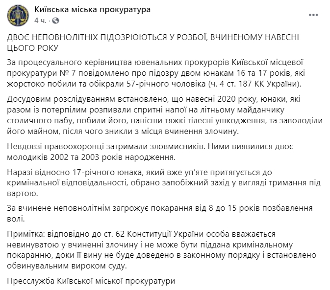 В Киеве двум подросткам, которые жестоко избили и обокрали 57-летнего мужчину, сообщили о подозрении. За это несовершеннолетним грозит наказание в виде лишения свободы от 8 до 15 лет.