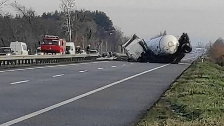 На трассе перевернулся грузовик, движение заблокировано. Фото: kyivregionpatrolpolice