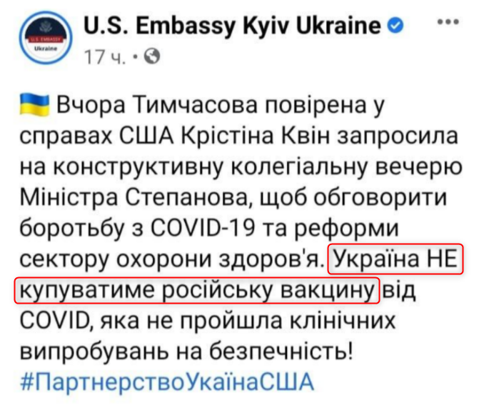 Осенью американцы открытым текстом запретили Украине покупать российскую вакцину.