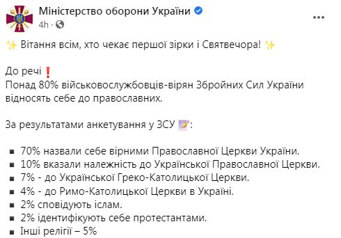 Отмечается, что 70% опрошенных военнослужащих (от числа верующих) относят себя к Православной Церкви Украины, 10% - к Украинской Православной Церкви.