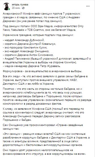 "Все эти люди - те, кто активно заявляли о делах семьи Байдена в Украине, выступали против внешнего управления, НАБУ, Демпартии США и ее лобби в Украине, - пишет главный редактор "Страны" Игорь Гужва. - Понятно, что это месть со стороны не только Байдена, но и американского истеблишмента за то, что весь мир услышал, например, разговоры Байдена и Порошенко, после которых понятие "внешнее управление" окончательно перешло из разряда конспирологии в разряд доказанных фактов.