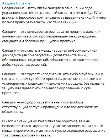 "Соединенные Штаты ввели санкции в отношении ряда украинцев. Как человек, который когда-то выиграл Суд ЕС и взыскал с Евросоюза компенсацию за введение санкций, имею полное право разъяснить, что такое санкции.