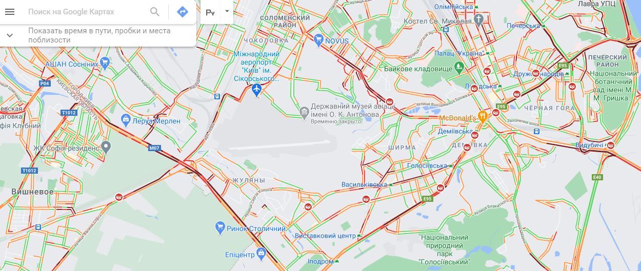 18:41 Затруднено движение на Кольцевой дороге, на выезде из Теремков, в районе Жулян, Борщаговки. На Большой окружной возле Феофании.