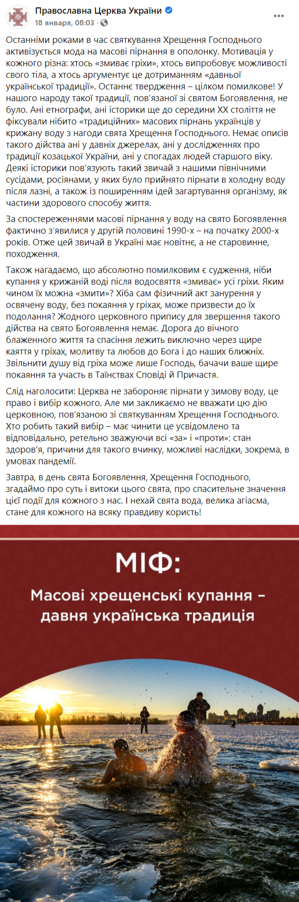 В ПЦУ заранее подготовили почву и выпустили анти-купальный материал в Крещенский Сочельник, 18 января. Церковь Епифания заявила, что массовые крещенские купания - это не украинское изобретение, а традиция "наших северных соседей россиян".