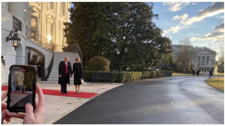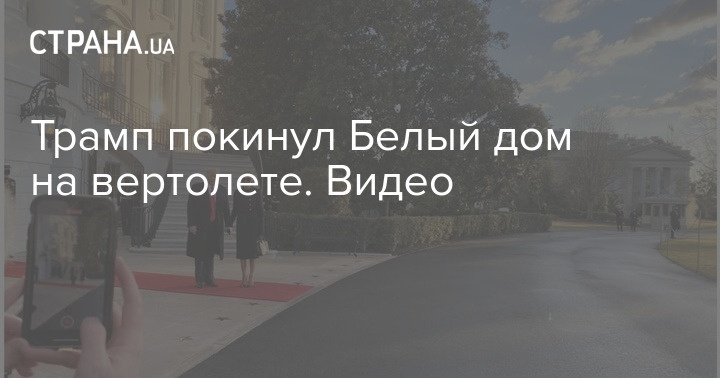 На видео можно рассмотреть, что у Белого дома столпились провожающие и расстелена красная дорожка, по которой, вероятно, из резиденции вышли Дональд и Мелания Трамп. Прямо на лужайке их ожидает вертолет.