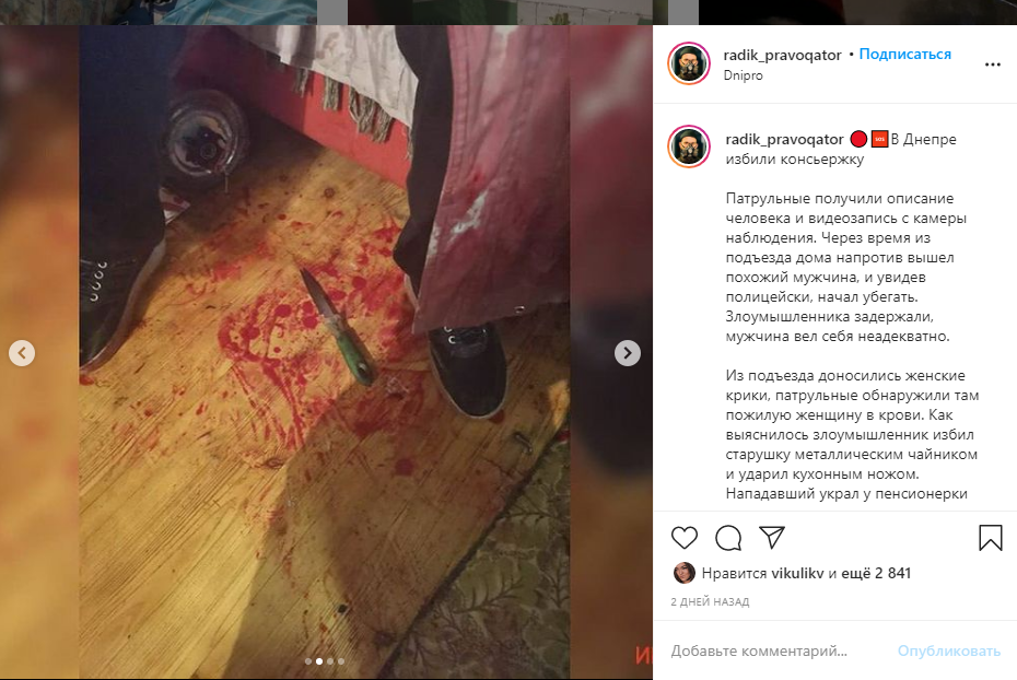 Позже из подъезда правоохранители услышали крики, а затем обнаружили там окровавленную 70-летнюю женщину. Выяснилось, что фигурант ворвался домой к консьержке, схватил чайник и начал бить им хозяйку по голове, после чего душил ее и бил в спину ножом. Не найдя никаких ценностей у потерпевшей, фигурант забрал 70 гривен и собирался уходить, но его вовремя заметили сотрудники полиции.