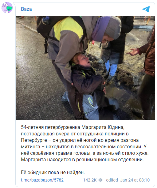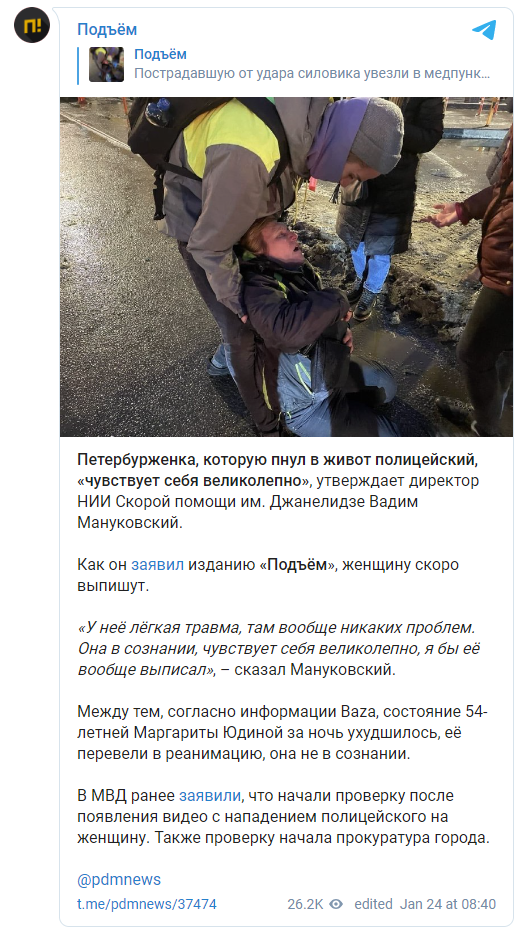 В Санкт-Петербурге в субботу, 23 января, во время задержаний на акции в поддержку оппозиционера Алексея Навального, силовик ударил женщину ногой в живот. В сети появляются противоречивые данные о ее состоянии. На данный момент известно, что полиция уже извинилась перед пострадавшей.
