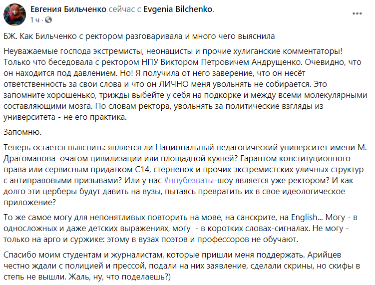 "Неуважаемые господа экстремисты, неонацисты и прочие хулиганские комментаторы! Только что беседовала с ректором НПУ Виктором Петровичем Андрущенко. Очевидно, что он находится под давлением. Но! Я получила от него заверение, что он несёт ответственность за свои слова и что он ЛИЧНО меня увольнять не собирается. Это запомните хорошенько, трижды выбейте у себя на подкорке и между всеми молекулярными составляющими мозга. По словам ректора, увольнять за политические взгляды из университета - не его практика.