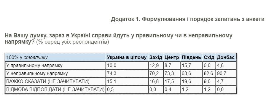 Выяснилось, что почти три четверти украинцев (74%) считают, что в целом дела в Украине идут в неправильном направлении. И только 10% населения довольны тем, как развивается страна. 15,7% респондентов не определились с ответом или отказались отвечать на вопросы.