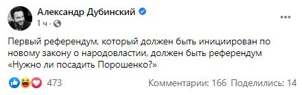 "Первый референдум, который должен быть инициирован по новому закону о народовластии, должен быть референдум "Нужно ли посадить Порошенко?" - пишет нардеп "Слуги народа" Александр Дубинский.