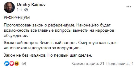 "Проголосован закон о референдуме. Наконец-то будет возможность все главные вопросы вынести на народное обсуждение.