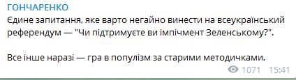 "Единственный вопрос, который следует немедленно вынести на всеукраинский референдум - "Поддерживаете ли вы импичмент Зеленского?" Все остальное пока - игра в популизм по старым методичкам", - отреагировал нардеп от партии Порошенко Алексей Гончаренко.